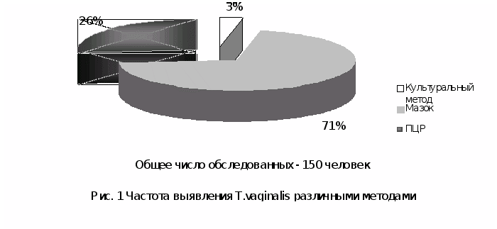 В ходе проведения собственных исследований по сравнению различных методов диагностики трихомоноза у мужчин, общее количество которых составляло 150 человек, были получены следующие результаты: наиболее удачным методом диагностики трихомоноза является метод микроскопии окрашенного мазка. Его информативность составила 71%. За ним следует метод ПЦР, (включающий в себя данные исследований по различным группам), он составил 26%. И наименее информативным, а, следовательно, менее надежным методом диагностики трихомоноза, оказался культуральный метод. Его информативность составила 3%. Полученные результаты отражены на рисунке 1.