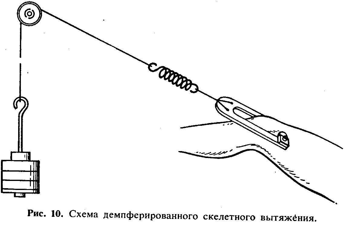 скелетное вытяжение. Тягу непосредственно за кости чаще всего применяют при лечении переломов костей конечностей, реже—для печения повреждений позвоночного столба, таза, грудной клетка Пострадавший должен соблюдать заданный режим и активно участвовать в процессе лечения, ill о Казани я: (закрытые и открытые диафизарные, около- и внутрисуставные переломы и переломовывихи конечностей, додготовка больного к операции (остеосинтез. Устранение застарелого вывиха, эндопротезирование и т. п.); переломы и переломовывихи
