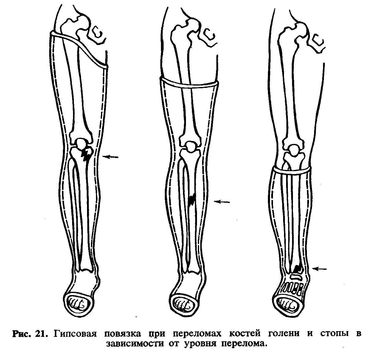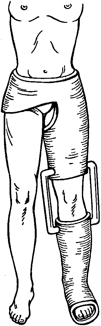 Лечение. При изолированном переломе малоберцовой кости без смещения осуществляют иммобилизацию конечности гипсовой повязкой. При переломах в нижней трети накладывают У-образную лонгетную повязку, в средней трети—циркулярную гипсовую повязку до середины бедра, в верхней трети—циркулярную повязку до верхней трети бедра. Срок фиксации 4 нед, дозированная нагрузка показана череб 2 нед. Трудоспособность восстанавливается через б нед.