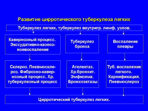 цирротический туберкулез с частыми рецидивами: больной начинает лихорадить (лихорадка, как правило субфебрильная), проявляется синдром интоксикации, который чаще всего проявляется тем, что больной теряет в весе. Больной быстро обезвоживается, худеет и процесс, в связи с частым рецидивированием начинает прогрессировать и фиброзная ткань захватывает половину легкого, целое легкое. Нередко поражается второе легкое, за счет бронхогенного обсеменения. Неизбежно, в обязательном порядке формируются бронхоэктазы.