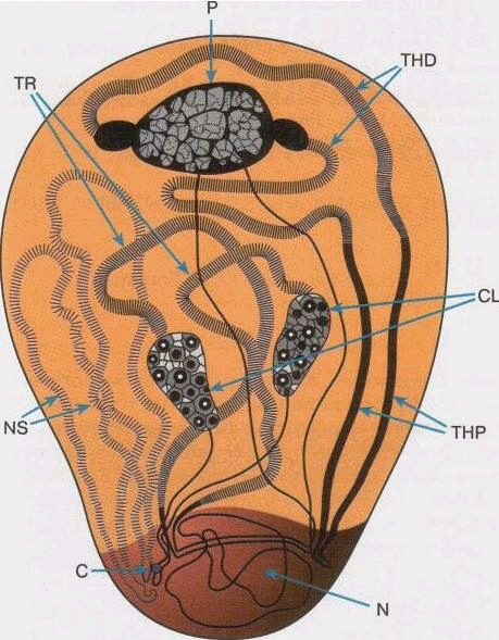 Рис. 3. Общий вид ядра спермотоцита у самца Drosofilia hydei (из [1], с.62). TR, P, THD, CL, THP, NS – названия петель, С – центромера, N - ядрышко