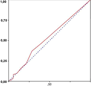Рис. 1 – Кривая receiver operating для разных концентраций лейкоцитов и бактериоспермии. Площадь под кривой 0,53 (95% доверительный интервал 0,44-0,63), См. данные в Таблице 3.