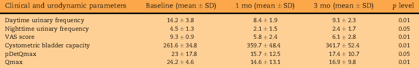 Результаты: в целом, 12 пациентов (85,7%) сообщили о субъективном улучшении через 1 и 3 месяца. Средние показатели по шкале VAS были значительно снижены через 1 и 3 месяца после лечения (p < 0.05 для обеих групп), дневная и ночная частота мочеиспусканий значительно уменьшилась (p < 0.01 и p < 0.05 соответственно), цистометрическая емкость мочевого пузыря увеличилась (p < 0.01). Два пациента сообщили о неполном опорожнении мочевого пузыря. Мы не обнаружили никаких системных побочных эффектов ни в течение лечения, ни после него.