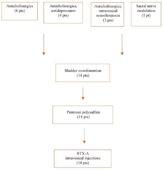 В исследование были отобраны и включены 14 пациентов, отвечающие всем критериям. После кратковременной общей анестезии пациентам выполнялась инъекция 200 U BTX-A (Allergan, Irvine, CA), разведенного в 20 мл 0,9% физиологического раствора. Инъекции были выполнены через цистоскоп гибкой иглой в подслизистый слой треугольника и дна мочевого пузыря. В один участок вводилось количество токсина не более 10 U BTX-A. После инъекции BTX-A устанавливался катетер Фоллея диаметром 16 Ch на 24 часа. Ночью за пациентам проводилось наблюдение и слежение за выделением мочи и болью. Урофлоуметрия с определением остаточного объема мочи была выполнена после удаления катетера. Клиническая оценка, подсчет по шкале VAS, цистоскопия и уродинамика были повторены через 1 и 3 месяца. Локальные и системные побочные эффекты не были отмечены в течение лечения и после его завершения.