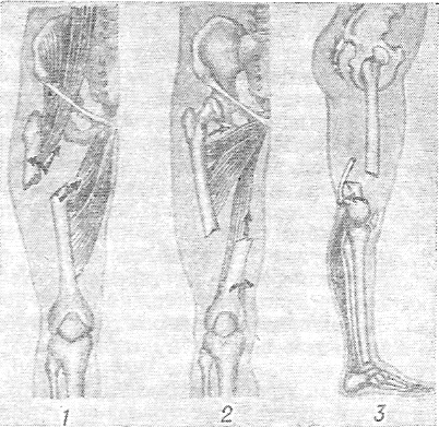 Рис. 2. Схематическое изображение смещения костных отломков при переломах в верхней ( 1 ), средней ( 2 ) и нижней ( 3 ) трети бедра.