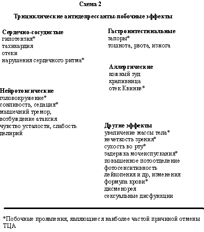 Первую группу образуют необратимые ингибиторы МАО3 и трициклические антидепрессанты (ТЦА). Большинство ТЦА (амитриптилин – триптизол, нортриптилин – помелор, имипрамин – мелипрамин, кломипрамин – анафранил, дибензепин – поверил и др.) обладают универсальной активностью (воздействие на широкий спектр депрессий – от тяжелых до субсиндромальных). Несмотря на то что их применение сопровождается побочными действиями (схема 2), в ряде случаев препятствующими продолжению лечения, ТЦА можно рассматривать как наиболее хорошо исследованные и надежные средства терапии депрессий 4.