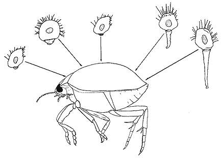 Несколько лет назад автору этих строк удалось собрать около 30 экземпляров водяных жуков Hyphydrus ovatus из разных биотопов. Надкрылья жуков были густо покрыты инфузориями-сукториями Discophrya lichtensteinii. Даже визуально было заметно, что размер инфузории зависел от места ее расположения: чем ближе к заднему концу тела жука, тем длиннее был ее стебелек. Естественно было предположить, что такая закономерность связана с распределением гидродинамических нагрузок по поверхности надкрыльев. Необходимые расчеты помог выполнить сотрудник Института гидромеханики В.А.Кочин. Действительно, длина стебелька сукторий оказалась достоверно связана с параметрами пограничного слоя. Проанализировав опубликованные в научной литературе сведения об изменчивости размеров инфузорий в зависимости от их локализации, мы окончательно утвердились в своем предположении. И тогда нас стали интересовать не столько сами факторы, действующие на организмы в пограничном слое, сколько механизмы их адаптации к этим факторам [2]. Оказалось, что пограничный слой как биотоп имеет определенную структуру независимо от типа субстрата, что позволило рассматривать его в качестве комплекса потенциальных местообитаний, т.е. своеобразной адаптивной зоны сидячих простейших [3].