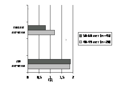 Концентрат нативных ФЛ “Витол” оказывает значительное влияние на липидный состав как в группе больных в возрасте от 40 до 49 лет, так и более старшей возрастной группе (от 50 до 60 лет). При этом в более старшей возрастной группе после приема “Витола” содержание ФХ достоверно выше (что не способствовало изменению соотношения легкоокисляемых фракций к трудноокисляемым), а коэффициент ОХС/ОФЛ (Рис.11) достоверно ниже, чем в группе больных в возрасте от 40 до 50 лет.
