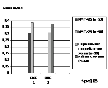Фосфолипидный концентрат “Витол” оказывал более выраженное (p<0,05) влияние, проявлявшееся в более низком содержании ОХС (0,250,025 мкмоль/мл) у лиц, не ограничивавших потребление животных жиров по сравнению с больными ИБС, не злоупотреблявших жирами (0,340,028 мкмоль/мл). Показатели ПОЛ и звеньев антиоксидантной защиты при избыточном потреблении жиров существенно не отличались от таковых у больных без избыточного потребления животных жиров.