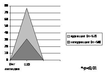 Комплекс нативных ФЛ “Витол” у некурящих больных ИБС оказывал более выраженное воздействие на фосфолипидный состав мембран Тр. (Рис.7). Данные корреляционного анализа также показывают, что курение имеет обратную связь уровнем ОФЛ (r>xy>=0,360; p<0,05) и прямую связь с содержанием ОХС (r>xy>=+0,453; p<0,05).