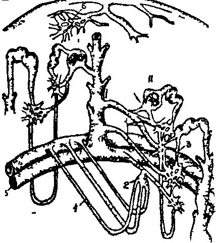 1 - извитой канадец 1-го порядка (проксимальный каналец); 2 - извитой каналец 2-го порядка (дистальный каналец); 3 - тонкая часть петли Генле; 4 - капилляр.
