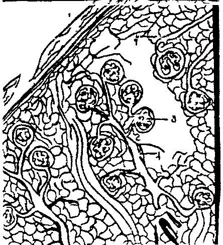 I - подоциты; 2 - капилляр; 3 - мезангиальные клетки; 4 - базальная мембрана;