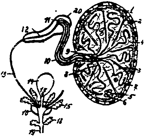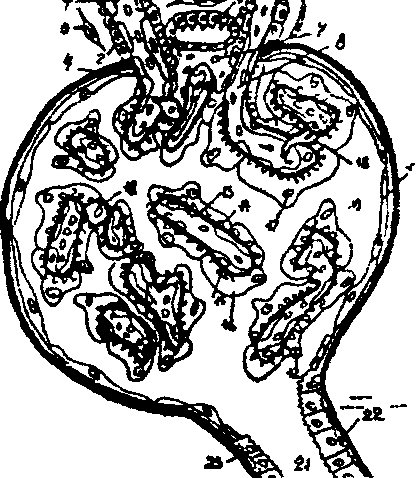 1 - капсула почечного тельца (Шумлянского-Боумена); 2 - полость капсулы; 3 - наружный листок капсулы; 4 - извитой каналец 1-го порядка (проксимальный каналец); 5 - нисходящая часть петли Генле; 6- восходящая часть петли Генле; 7 - извитой каналец 2-го порядка (дистальный каналец); 8 - собирательная трубочка; 9 - приносящая артериола; 10 - выносящая артериола; 11 - сосудистый клубочек (чудесная сеть).