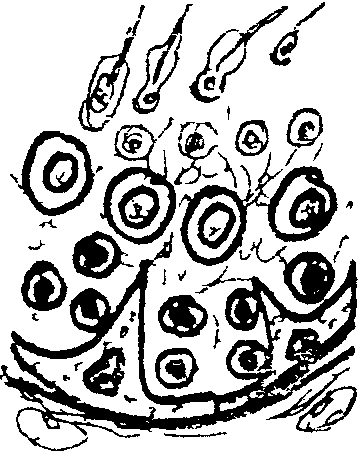 На 3-й неделе эмбрионального развития, в стенке желточного мешка появляются первичные половые клетки - гонобласты, которые быстро размножаясь, продвигаются по кровеносным сосудам и внедряются в половые валики. Гонобласты являются источников половых клеток - ГОНОЦИТОВ или ГАМЕТОЦИТОВ, а эпителий половых валиков превращается в поддерживающие клетки СЕРТОЛИ и ИНТЕРСТИЦИАЛЬНЫЕ КЛЕТКИ (гландулоциты или клетки Лейдига). Рис. 1. Поддерживающие клетки обеспечивают трофику созревающих клеток, а гландулоциты осуществляют выработку половых гордонов. Затем от половых валиков в строму первичной почки врастают половые шнуры, представляющие собой тяжи эпителиальных клеток в центре которых залегают гонобласты. Одновременно от Вольфова протока отщепляется второй проток. - Мюллеров. На этом заканчивается индифферентная стадия.