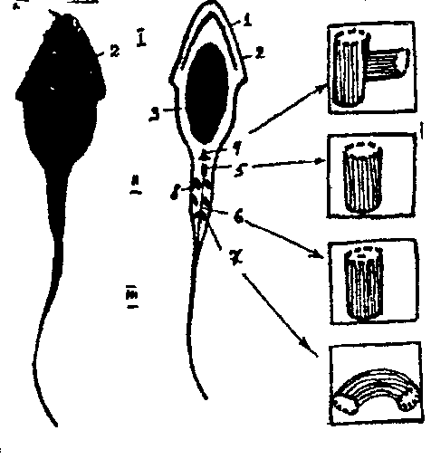 б) схема строения сперматозоида