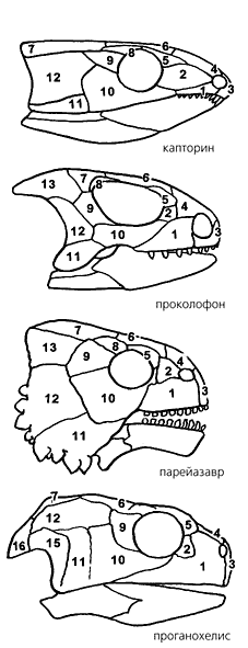 Черепа анапсид. Такие безоконные конструкции свойственны и триасовой черепахе проганохелису, и остальным более древним пресмыкающимся, объединяемым в сборные группы котилозавров и парарептилий. Однако, как видно из нумерации, сплошная крыша черепа построена из разных наборов костей. |