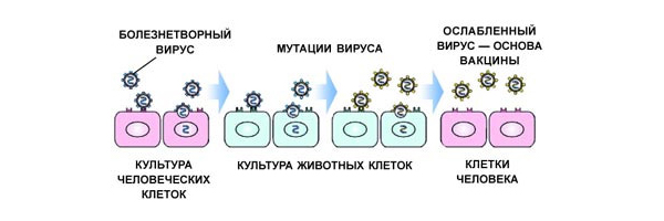 Один из традиционных методов ослабления вирусов — выращивание в животных клетках. Сначала болезнетворный вирус выделяют из культуры человеческих клеток. Выращивание вне человеческого организма само по себе ослабляет «заразность» вируса. Для некоторых заболеваний, например краснухи, такой подготовки бывает достаточно, чтобы получить вакцинный штамм. Однако в общем случае, для того чтобы получить ослабленный штамм, вирус пересаживают в среду, приготовленную из клеток животных. Благодаря мутациям вирус приспособится к новой среде обитания. Для создания вакцины ученые отбирают те разновидности вирусов-мутантов, которые плохо растут на человеческих клетках, а значит, не могут вызвать болезнь |