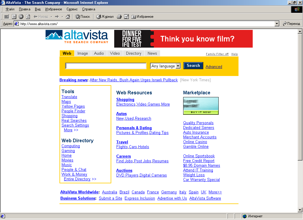Одна из наиболее популярных поисковых систем Altavista Search появилась в декабре 1995 года. Первоначально она задумывалась как демонстрация мощи 64-разрядного сервера Alpha APX корпорации Digital Equipment, однако быстро приобрела самостоятельное значение как эффективное и мощное средство поиска.