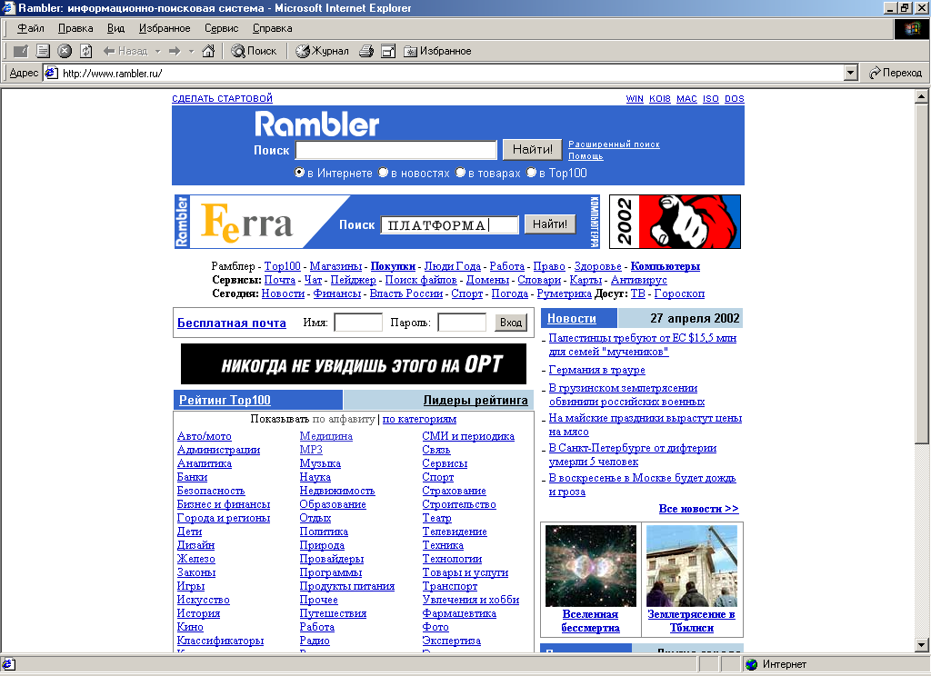 Rambler - одна из самых молодых поисковых машин (осень 1996 г), авторы которой учли опыт и ошибки предыдущих попыток создать поисковую машину. На сегодняшний день это самая мощная и самая популярная поисковая машина в российской части Internet.