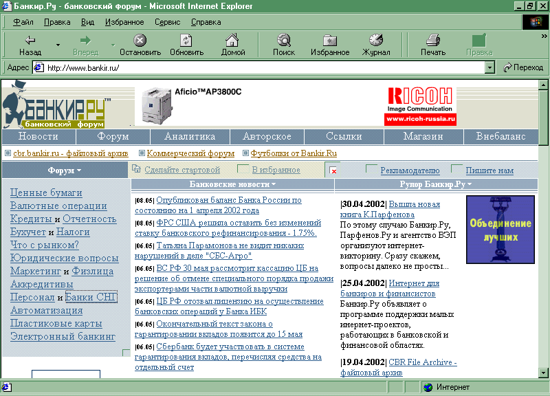 Этот сайт полностью посвящён банкирам, банковскому делу. На нём можно прочитать о ценных бумагах, валютных операциях, кредитах, бухучёте и налогах, а также найти любой банк в пределах СНГ.