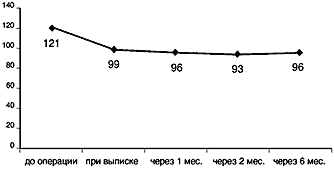 По данным компьютерной статической периметрии на приборе «ПЕРИКОМ» до операции среднее число суммарных дефектов было 121±9 условных единиц, при выписке – 99±9 (Р<0,10) и через 1, 2 и 6 мес после операции было соответственно 96±8 (P<0,05), 93±9 (P<0,05) и 96±13 (P<0,10) (рис. 3).