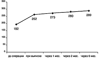 Результаты кинетической периметрии: до операции среднее суммарное поле зрения (8 меридианов) было 192±14 градусов, при выписке 262±15 (Р<0,001) градусов и через 1, 2 и 6 мес после операции было соответственно 273±16 (P<0,001), 280±16 (P<0,001), и 289±26 (P<0,002) градусов (рис. 2).