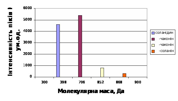 Проте, глікоалкалоїди картоплі являють собою досить велику групу сполук, до складу якої входять «мажорні» (a-соланiн та a-чаконiн у культурних видів картоплі) і численні «мінорні» (b-соламарін, деміссидін, 5b-соланідан-3a-ол, томатіденол) компоненти. Крім того, тканини рослин картоплі містять спеціалізовані ферментні системи, які модифікують інтактні молекули глікоалкалоїдів з утворенням численних проміжних сполук, фізіологічна роль яких вичерпно не з’ясована (b-соланін, b-чаконін, g-соланін, g-чаконін тощо)[ ]. Таким чином, дослідження статичних і динамічних кількісних та якісних параметрів глікоалкалоїдів рослин картоплі різних сортів в процесах вирощування в умовах конкретних кліматичних зон, зберігання та переробки, а також під впливом фітопатогенів, мають певні перспективи за умов використання з метою аналізу цих сполук нових високоінформативних фізико-хімічних методів досліджень [ ]. В Сумському ДАУ та Інституті прикладної фізики НАНУ (м.Суми) в 1994-2000 рр. в межах проекту «М’якоіонізаційна мас-спектрометрія в агробіології» провели цикл досліджень глiкоалкалоїдів рослин картоплi за допомогою новiтнього фiзико-хiмiчного методу аналізу полярних, термолабільних, нелетючих органiчних сполук – плазмено-десорбційної часопрольотної плазмено-десорбцiйної мас-спектрометрiї з iонiзацiєю уламками подiлу 252Cf (МС-ПДМС)[ ].