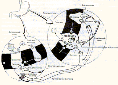 Решающим звеном в патогенезе язвенной болезни также является дисбаланс между факторами агрессии и факторами защиты слизистой оболочки желудка и ДПК. Важное место в ульцерогенезе отводится усилению воздействия агрессивного фактора, связанного с увеличением продукции НСl. Избыточная продукция последней при язвенной болезни, с одной стороны, генетически детерминирована (увеличение массы обкладочных клеток, повышенное высвобождение гастрина в ответ на прием пищи), с другой стороны, связана с нарушением нейроэндокринной регуляции (усилением вагусного влияния, гиперплазией и гиперфункцией G-, ЕСL-клеток).