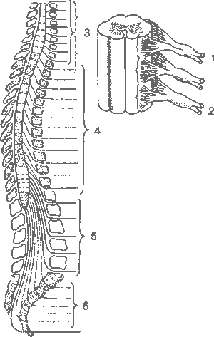1 – задний корешок; 2 – передний корешок; 3 – шейные сегменты С >1 >- С >8)>; 4 – грудные сегменты (Т >1 >- Т >12)>; 5 – поясничные сегменты (L >1 >- L >5)>; 6 – крестцовые сегменты (S >1 >- S >5)>