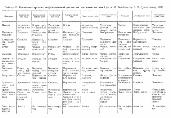 Дифференциальная диагностика ком нередко затруднена из-за отсутствия сознания. Характерные дифференциально-диагностические признаки некоторых заболеваний, приводящих к коматозным состояниям, представлены в табл. 29.