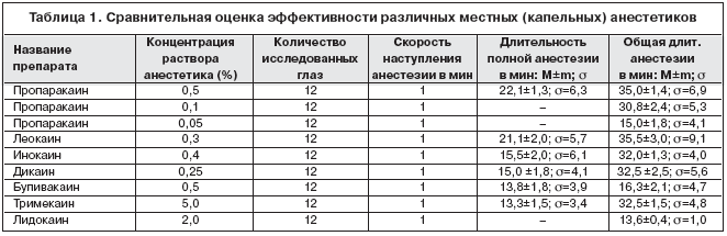 Основным критерием выбора препаратов для капельной анестезии операций является низкая эпителиальная токсичность. Использование 0,5% и 1% дикаина нежелательно из–за выраженных изменений эпителия, быстрого его слущивания во время вмешательства и частого развития дистрофических состояний после операции, хотя этот препарат и обеспечивает стойкую анестезию. Из отечественных препаратов наиболее приемлемыми для этих целей считают 0,3% леокаин, 2% лидокаин и 0,5% пропаракаин [4]. Требования, предъявляемые к капельным местным анестетикам в различных сферах офтальмологии, имеют свои особенности. Для анестезии хирургических и лазерных операций необходимы препараты более высоких концентраций, вызывающих длительную и глубокую потерю чувствительности тканей глазного яблока. В оптометрии для купирования боли после рефракционных операций достаточно использовать минимальные концентрации раствора анестетика, которые не оказывают токсического воздействия на эпителий роговицы и вызывают неглубокую поверхностную анестезию [5].