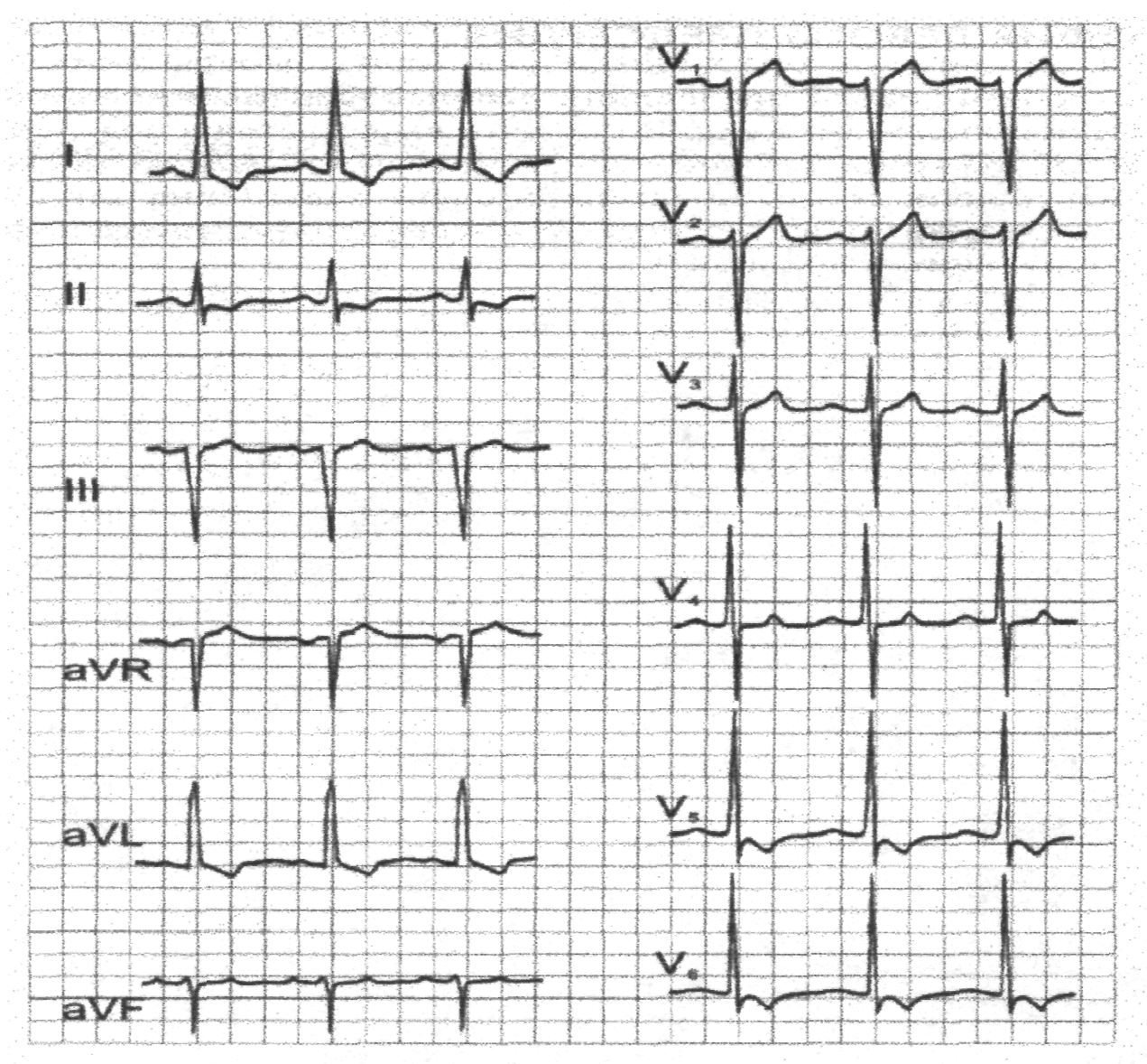 – на ЭКГ признаки гипертрофии левого желудочка – ЭОС горизонтальная, увеличение высоты зубца R в отведениях V5-V6, увеличение глубины зубца S в отведениях V1-V2, расширение комплекса QRS в отведениях V5-V6, смещение сегмента ST ниже изолинии в отведениях V5-V6