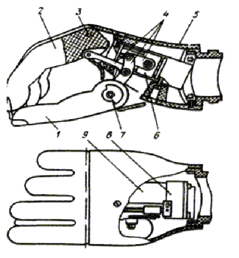 I пальца, микроэлектродвигателя 9 с редуктором 8, системы рычагов 4, соединяющих ползун винтовой пары 6 редуктора с пальцами кисти. Пальцы кисти вращаются вокруг осей 7 и 3. При изменении направления вращении якоря электродвигателя движение пальцев кисти меняется на противоположное, так что, управляя вращением якоря, можно выполнять сгибание и разгибание пальцев. Изменение направления вращения якоря в данной конструкции осуществляется путем. Изменения полярности подводимого к электродвигателю напряжения от источника питания.
