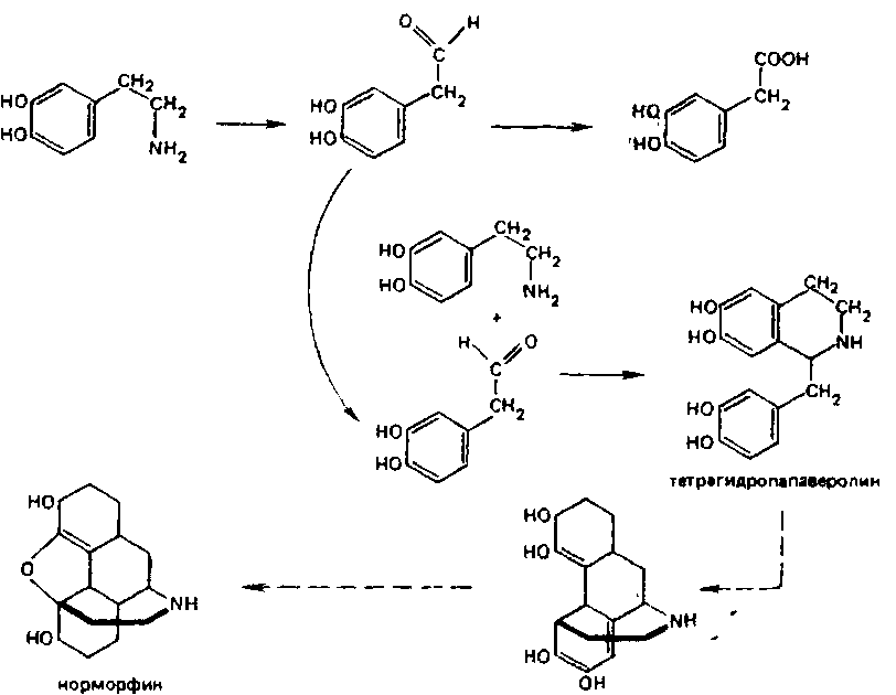 Адетальдегид способен также тормозить один из этапов катаболизма дофамина – его окислительное дезаминирование, – так что накапливается промежуточный продукт – 3,4 – диокси-фенилацетатальдегид. Последний, взаимодействуя опять-таки с дофамином, образует тетрагидропапаверолин, способный, в свою очередь, превращаться в соединения, все более приближающиеся по структуре к морфину, в том числе – норморфин: