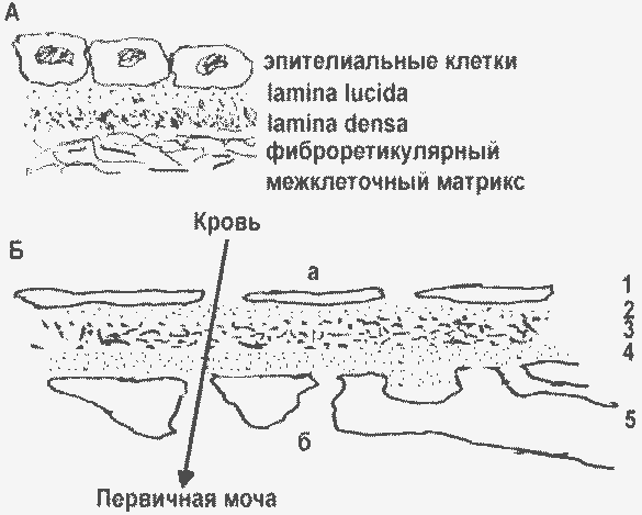 Базальные мембраны разных органов (А) и капилляров почечного клубочка (Б): а – люмен капилляры; б – полость Боуменовой капсулы; 1 – эндотелий; 2,3,4 – БМ клубочка (2 – lamina rara interna, 3 – lamina densa, 4 – lamina rara externa); 5 – подоцит, отростками контактирующий с БМ. |