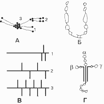 Молекулы базальных мембран. А. Многомолекулярные структуры, образуемые коллагеном IV: 1 - тетрамер; 2 - димер; 3 - мономер. Б. Фибронектин. В. Основные гепарансульфат-протеогликаны БМК: 1 - перлекан; 2 - ГСПГ 200 кДа; 3 - ГСПГ 350 кДа (горизонтальные линии - пептидные цепи, вертикальные линии - гепарансульфатные цепи). Г. Ламинин. |