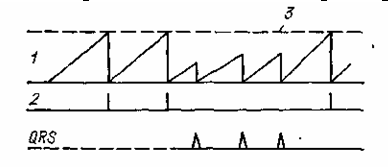 Напряжение на конденсаторе возрастает, пока не достигнет уровня срабатывания, и цепь генерирует импульс. Однако при появлении каждого комплекса QRS напряжение на конденсаторе возвращается на исходный уровень, и начинается следующий интервал ожидания (запирания). Если на протяжении всего интервала ожидания не произойдет еще одно запирание, то в конце этого интервала генерируется импульс. Пример возможной схемы реализации этого принципа приведен на рис. 8. Конденсатор С заряжается через резистор R2. При достижении определенного напряжения (задаваемого делителем R2, R3) генерируется импульс Если отопрется транзистор VT, то разряд конденсатора С происходит раньше, и снова начинается заряд, причем импульс не генерируется.
