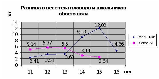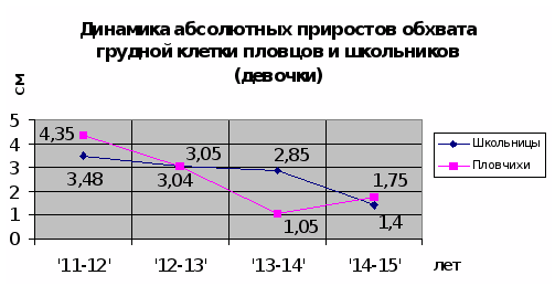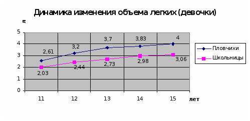Наибольшая разница в показателе ЖЕЛ была обнаружена в 15-летнем возрасте (ее величина составляет 2,24 л), что отражает влияние занятий плаванием на дыхательную систему детей и подростков.