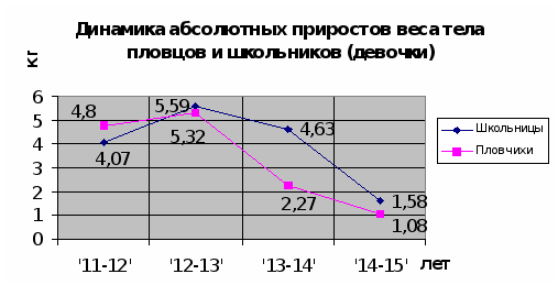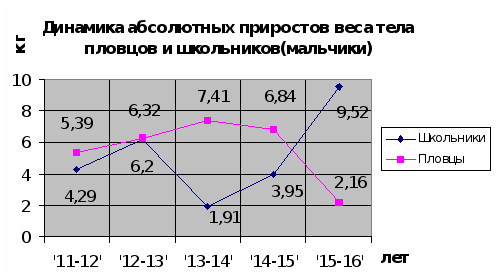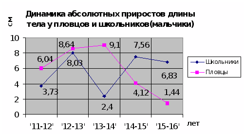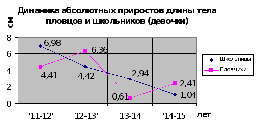 Анализ динамики абсолютных и относительных приростов показал, что в возрастном диапазоне 11-16 лет кривая роста длины тела у школьников носит двухпиковый характер: 12-13 лет - 8,03 см, 14-15 лет - 7,56 см; у пловцов же - однопиковый с максимальным приростом в 13-14 лет - 9,10 см (рис.4). У девочек обеих групп кривая роста имеет один пик, который приходится у школьниц на 11-12 лет и составляет 6,98 см, у пловчих сдвинут на один год (12-13 лет) и равен 6,36 см. (рис.7) Очевидно, что пловцы обоего пола вступают в пубертат в среднем на 1 год позже, чем школьники.