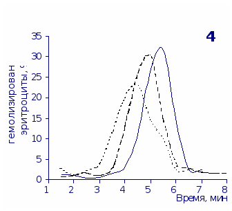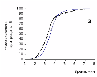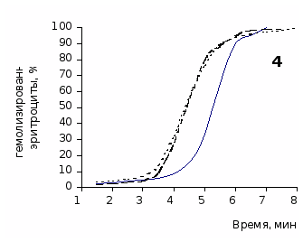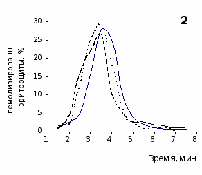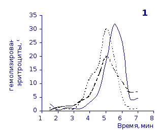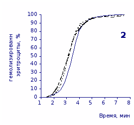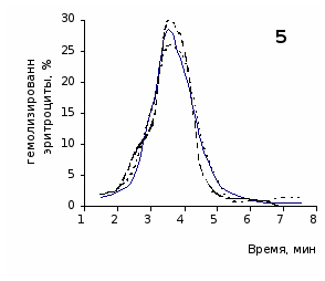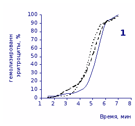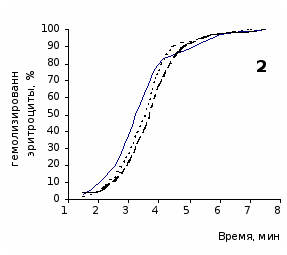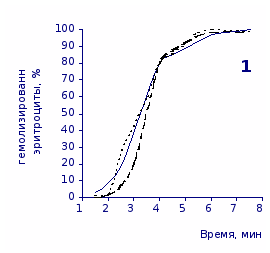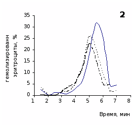 Измерения оптической плотности взвеси эритроцитов производили на фотоэлектроколориметре КФК-2 УХЛ 42 при красном светофильтре. В кювету рабочей ширины 10 мм вливали 2 мл взвеси эритроцитов из отдельной пробы и добавляли к ней в качестве гемолитика 2 мл 0,004 н HCl. После этого кювету помещали в кюветодержатель прибора. С момента введения во взвесь эритроцитов гемолитика величина светопропускания исследуемого раствора начинала изменятся в связи с разрушением клеток крови. Каждые 30 секунд отмечали показания прибора по шкале экстинкции (Е>о>). Измерение вели до получения двух совпадающих показаний, т.е. до завершения гемолиза (Е>n>). В результате получали ряд убывающих экстинкций, каждая из которых соответствовала степени гемолиза к моменту отсчета. По значениям оптической плотности вычисляли процент разрушенных эритроцитов за каждые 30 секунд, принимая разность Е>о>-Е>n> за 100%.