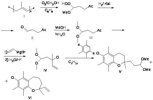 Даний синтез пропонується на базі нафтохімічної сировини: триметілгідрохінону і синтетичного ізопренового каучуку. Синтез ізопренового фрагменту здійснюють повним озонуванням ізопренового каучуку (І) до левулинового альдегіду (ІІ). Після захисту альдегідної групи у вигляді ацеталя, кетон (ІІІ) притягується у конденсацію із вініл магній бромідом та із 50% виходом отримуємо вінілкарбілол (ІV). Конденсація вінілкарбілолу (ІV) із триметилгідрохіноном до хромонів здійснюється у кислому середовищі у системі мурашина кислота-оцтова кислота. Реакція проходить з утворенням хромонового циклу ,що є у другому положенні моноізопреновий фрагмент, який є аналогом токоферолу. Було встановлено, що конденсація сполуки (ІV) з вінвлкарбінолом у традиційних умовах проходить неоднозначно. Наряду з цілеспрямованою конденсацією спостерігається знімання ацетильного захисту до альдегіду , який також конденсується за електрофільним механізмом у ароматичне кільце, утворюючи таким чином суміш продуктів (V) та (VІ) у відношенні 1:1. Щоб виключити знімання ацетильного захисту було проведена реакція сполучення речовини ІV з триметилгідрохіноном у гептані на алюмосилікатному каталізаторі “цеокар-10” , який має більш м’які кислі властивості , але в таких умовах спостерігається неоднозначність процесу з отриманням двох продуктів. Продукти конденсації V і VІ були розділені хроматографією на SіО2 . Встановлено, що в цих умовах переважно утворюється продукт V (до70%) і на 30% проходить конденсація по альдегідній групі. Структура отриманих сполук підтверджена на ІЧ- та ПМР-спектрах.