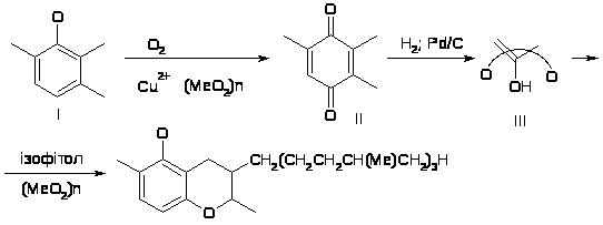 Схема синтезу токоферолу базується на окисленні 2,3,6-триметилфенолу (ІІ) з подальшою гетероцилізацією 2,3,6-триметилфенолу (ІІ) киснем активованим солями міді та конденсацією гідрохінону (ІІІ) з ізфітолом у присутності гелів оксидів металів:
