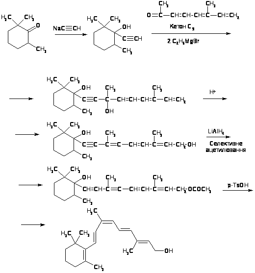 Виходячи з триметициклогексанону, який при дії ацеталіду натрі у рідкому аміаку дає 2,6,6-триметил-1-етинілциклогексанол-1. Останній конденсують за реакцією Грин”яра із кетоном С9 у гліколь С20 , який у кислому середовищі проходить через аллільне перегрупування. При відновленні гліколю дією алюмогідриду літію і ацетилування отримують моноацетат дегідратація якого за допомогою р-толуолсульфокилоти дає продукт, що містить 50% вітаміні А-ацетату. Синтез здійснюється за наступною схемою: