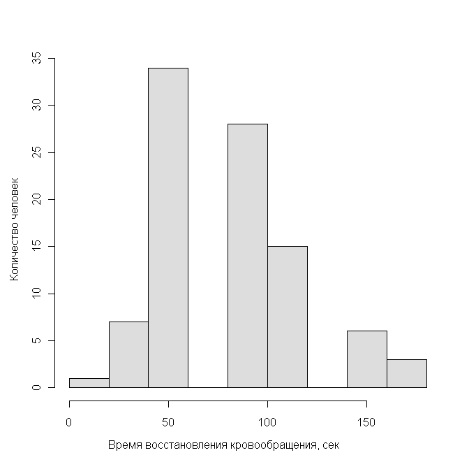 Наши данные (ВВ кровообращения и ВВ осязания, в секундах) мы обработали в программе «R». Для сравнения двух указанных выше параметров мы использовали тест Стьюдента для параметрических данных; для выяснения степени корреляции – корреляционный тест Пирсона.