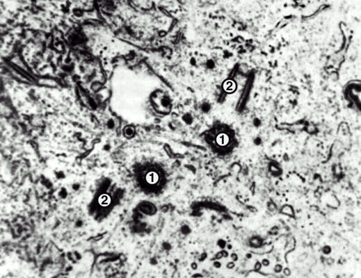Электронограмма клеточного центра (две центриоли в конце G>1>-периода клеточного цикла):