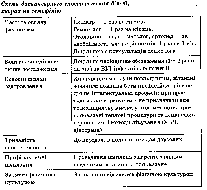 Кровотечі будь-якої тяжкості та локалізації, гематоми, гемартрози потребують негайного введення антигемофільних препаратів: кріопреципітату або фактора VIII при гемофілії А в дозі 15—50 ОД на 1 кг маси тіла. При гемофілії В — агемофілін В по 1 дозі 1—2 рази на добу внутрішньовенно, концентрат протромбінового комплексу PPSB із розрахунку 15 ОД на 1 кг маси тіла або свіжозаморожену антигемо-фільну плазму — 15 мл на 1 кг маси тіла повторно через 4—6 год протягом 4—5 днів з поступовим переходом до 1 разу на 3—4 дні (період напіврозпаду фактора VIII при первинному введенні становить 4— 8 рік, при повторному 12—36 год).