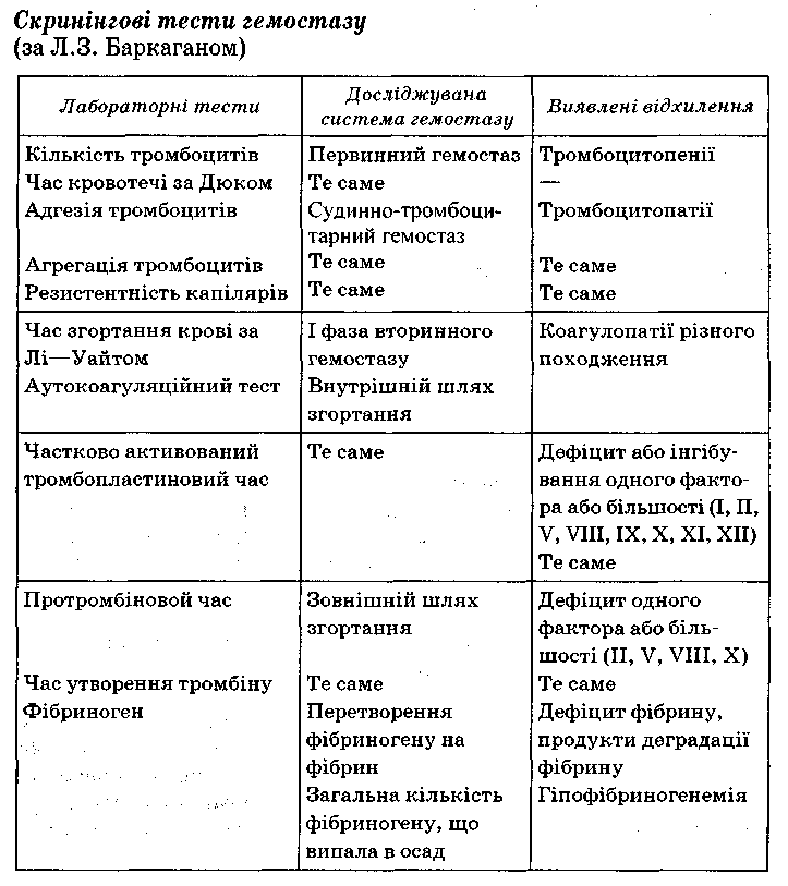 типові зміни загальних коагуляційних тестів: подовження часу згортання, збільшення часу рекальцифікації плазми, активованого часткового тромбопластинового часу;