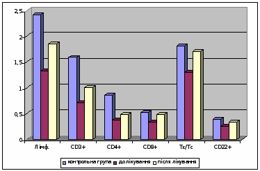 Імунологічне дослідження крові включало кількісну оцінку субпопуляцій лімфоцитів методом непрямої імунофлюоресценції за допомогою моноклональних антитіл з використанням люмінісцентного мікроскопа „Люмам 1-3”. При цьому рівень субпопуляцій Т і В-лімфоцитів – СД>3+ >, СД>4+>, СД>8+>, СД>16+>, СД>22+> розраховували в абсолютному та процентному відношенні. Сироваткові імуноглобуліни G, А та М визначили за методом Маnsini е.а. (1965). Функціональна активність Т-лімфоцитів оцінювалась шляхом проведення реакції бласттрансформації лімфоцитів з ФГА. Крім цього визначалась фагоцитарна активність нейтрофілів.