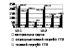 У хворих на ГГВ із дисоціативним типом імунологічного реагування була встановлена низька продукція регуляторного ІЛ-2 та протизапальних ІЛ-4 і ІЛ-10, тоді як рівні прозапальних цитокінів (ІЛ-1β, ФНП-α та ІЛ-6) підвищувалися пропорційно до ступеня тяжкості хвороби (рис.8). У періоді розпалу при порівнянні середніх показників ІЛ-1β, ФНП-α та ІЛ-6 у хворих із дисоціативним та нормореактивним типами імунного реагування статистичної різниці не відмічалося (р>0,05), але їх показники значно перевищували відповідні рівні контрольної групи (р<0,05).