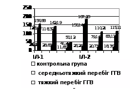 У періоді реконвалесценції ГГВ (рис.5В) спостерігалося вірогідне зниження показників прозапальних цитокінів як у хворих з середньотяжким, так і з тяжким перебігом, однак їх рівні ще продовжували перевищувати показники контролю: ІЛ-1β – у 4,3 і у 5,3 раза відповідно, ФНП-α – у 4 і 4,9 раза, ІЛ-6 – у 3,5 і 4,2 рази відповідно. Причому рівні ІЛ-1β та ФНП-α відрізнялися статистичною вірогідністю в групах порівняння із різним ступенем тяжкості ГГВ (р<0,05), окрім показників ІЛ-6 (р>0,05) та корелювали зі ступенем тяжкості ГГВ.